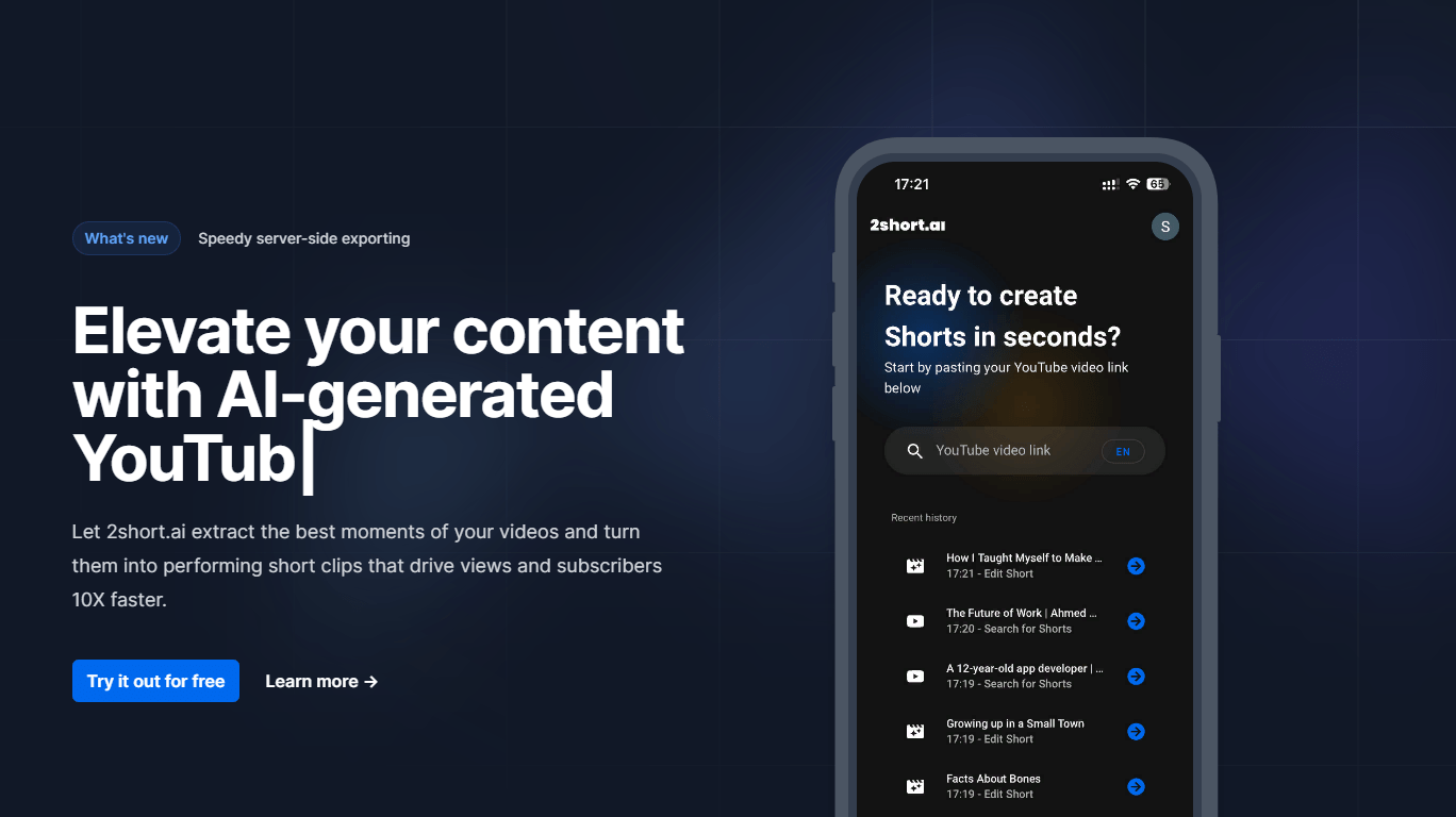 2short.ai — это инструмент на базе искусственного интеллекта, целью которого является оптимизация процесса создания привлекательных коротких видеороликов для таких платформ, как YouTube Shorts, Instagram Reels, TikTok и других подобных форматов. Оно решает общую проблему, с которой сталкиваются создатели контента, пытаясь сконденсировать более длинные видеоролики в захватывающие короткие клипы, которые находят отклик у аудитории.