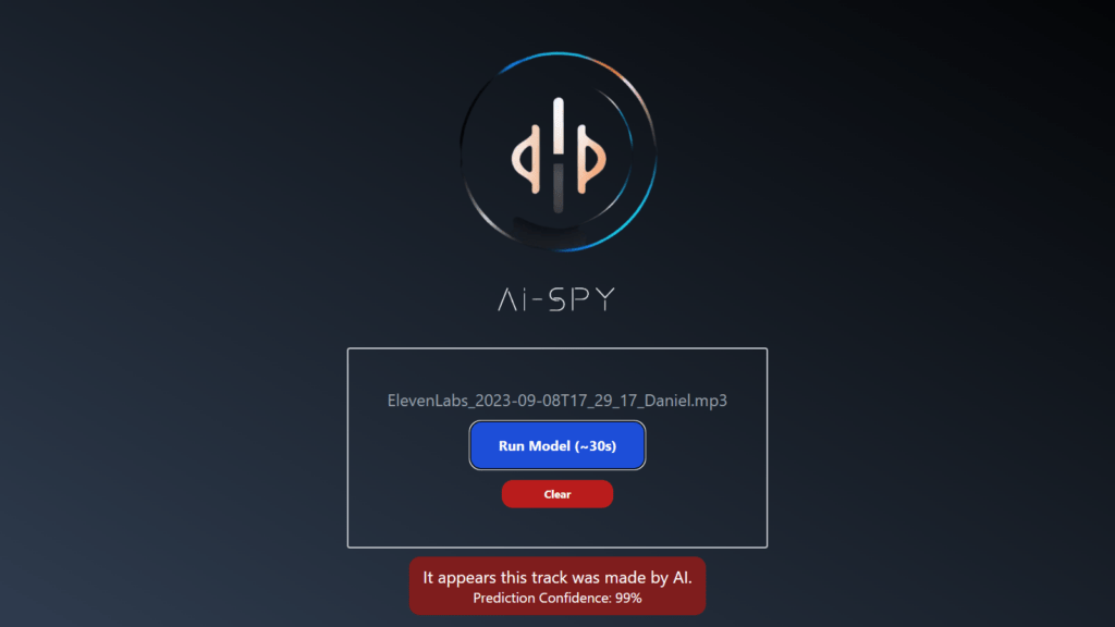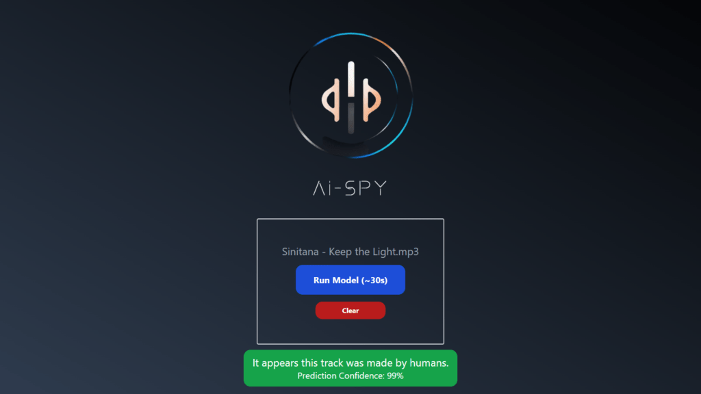 AISPY – незаменимый бесплатный инструмент в эпоху AI технологий, с помощью которого вы сможете вычислить, если любой аудио-файл был сгенерирован ИИ или создан человеком. AISPY обладает максимально простым функционалом – достаточно загрузить вашу аудио-дорожку, и далее AISPY проанализирует происхождение звука. Если файл был сгенерирован частично либо полностью создан с помощью нейросетей, вы увидите предупреждение.