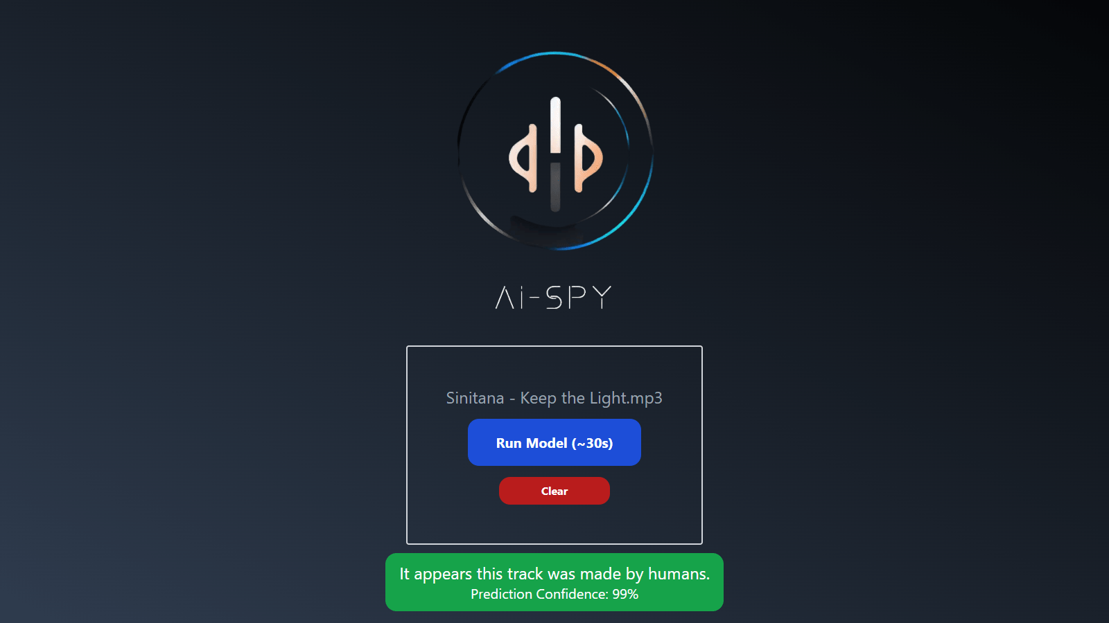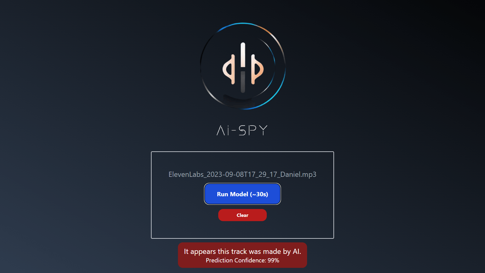 AISPY – незаменимый бесплатный инструмент в эпоху AI технологий, с помощью которого вы сможете вычислить, если любой аудио-файл был сгенерирован ИИ или создан человеком. AISPY обладает максимально простым функционалом – достаточно загрузить вашу аудио-дорожку, и далее AISPY проанализирует происхождение звука. Если файл был сгенерирован частично либо полностью создан с помощью нейросетей, вы увидите предупреждение.