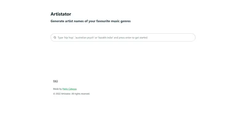 Сайт Artistator предоставляет возможность генерировать названия артистов в различных музыкальных жанрах. На странице FAQ можно найти ответы на часто задаваемые вопросы. Сайт создан Пабло Кабесасом в 2022 году.