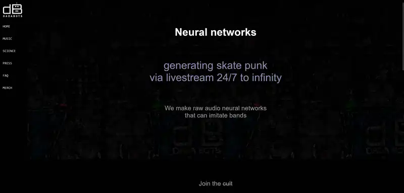 Данный сайт представляет собой музыкальный проект, использующий нейронные сети для создания музыки. Они генерируют сырые аудио файлы, имитирующие звучание различных музыкальных групп, таких как Archspire, John Coltrane, Nirvana и Gorillaz. Трансляция 24/7 в стиле Technical Death Metal и Free Jazz доступна на сайте в режиме онлайн. Кроме того, на сайте представлен магазин Merch и раздел FAQ для ответов на вопросы пользователей.