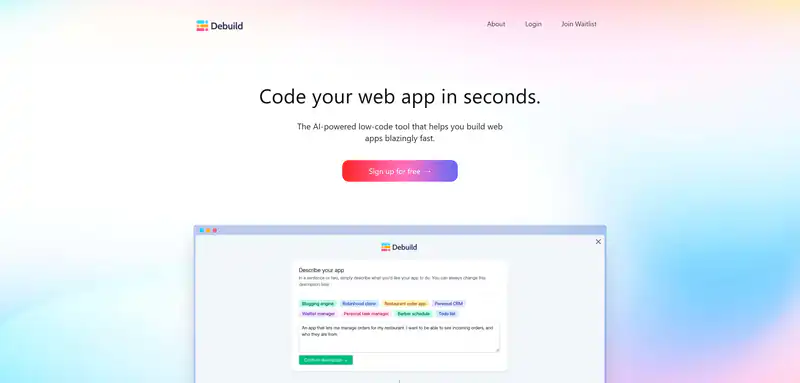 Debuild является инструментом низкого кода, использующим искусственный интеллект для быстрой разработки веб-приложений. Он позволяет создавать веб-приложения молниеносно и без необходимости писать много кода.
