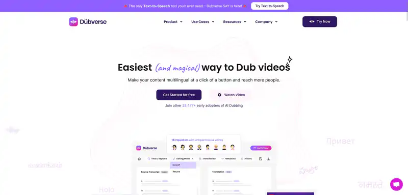 Dubverse — это онлайн-сервис, который предоставляет возможность автоматически дублировать видео на другие языки с помощью Text-to-Speech, машинного перевода и генеративного искусственного интеллекта. Dubverse SAY — это главный продукт этого сервиса, который позволяет создавать дублированные видео на более чем 30 языках мира с помощью более чем 150 голосовых актеров. На сайте можно ознакомиться с другими функциями Dubverse, такими как создание субтитров и генерация текста на основе речи, а также ознакомиться со списком отраслей, которые используют этот сервис, и примерами тематик, на которые дублируются видео.