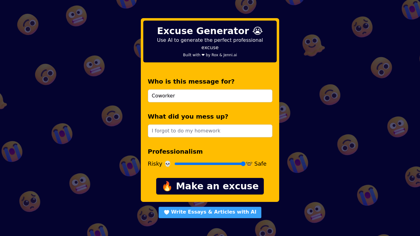 Регистрация для работы с Excuses Generator не требуется, не требуется и оплата, инструмент полностью бесплатный.