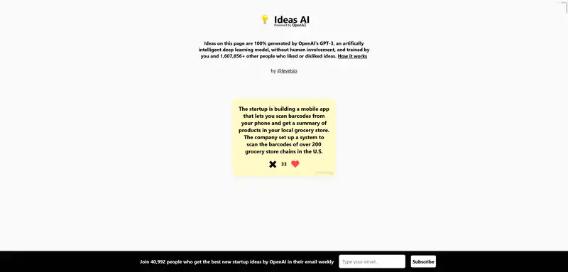 Ideasai предлагает сгенерированные идеи для тех, кто испытывает нехватку вдохновения. Идеи создаются исключительно с помощью искусственного интеллекта GPT-3 без участия людей. База данных инициализирована приблизительно 100 идеями для стартапов, после чего GPT-3 начинает генерировать больше идей, которые можно оценить как полезные или бесполезные. Полученные данные обратно попадают в GPT-3, чтобы улучшить качество создаваемых идей. Каждый день на сайте появляется несколько новых идей, а также можно подписаться на получение списка наиболее популярных новых идей еженедельно. Кроме того, авторы сайта предлагают посмотреть другие проекты на основе искусственного интеллекта, такие как Avatar AI, Interior AI и This House Does Not Exist.