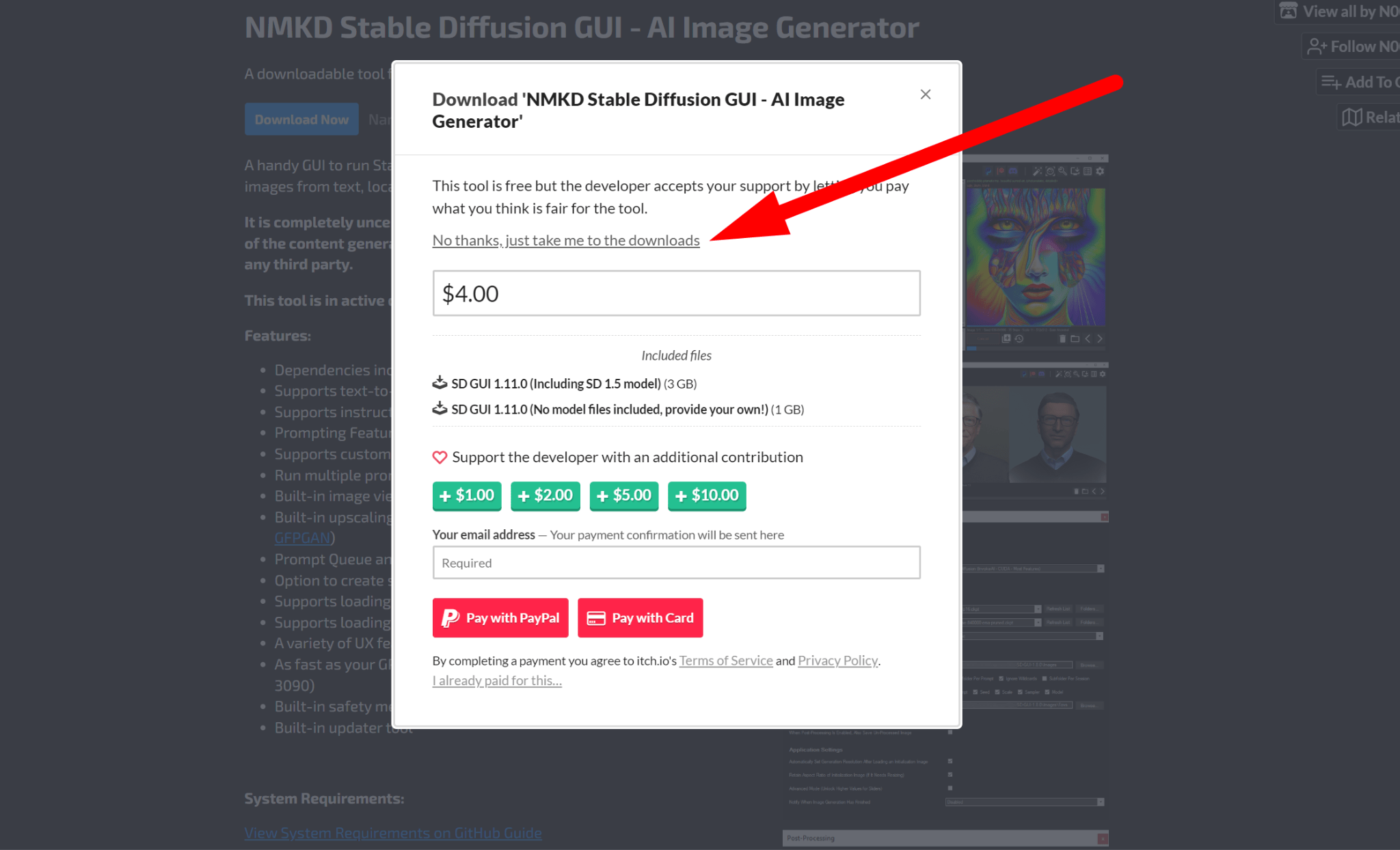 NMKD Stable Diffusion GUI – бесплатный установщик, работающий на базе донатов. Чтобы скачать бесплатно, кликните на фразу “No thanks, just take me to the downloads”: