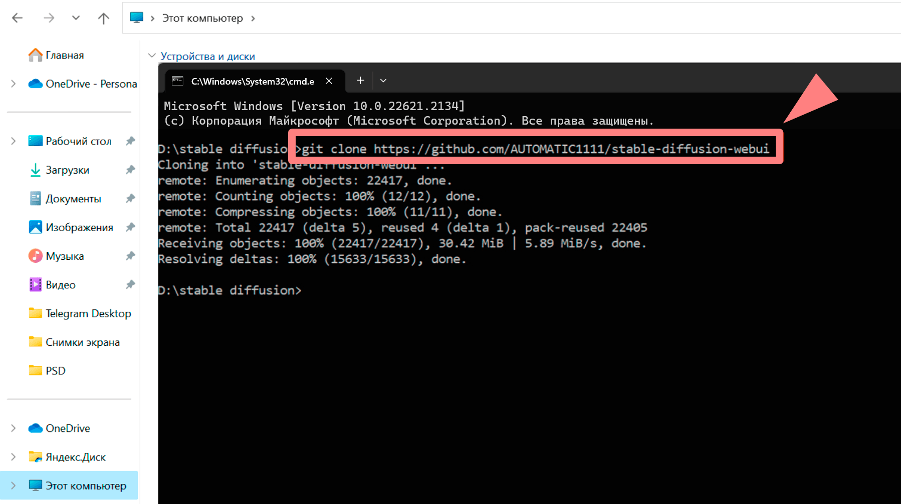 git clone https://github.com/AUTOMATIC1111/stable-diffusion-webui Далее дождитесь появления надписи “done” и можете закрывать командную строку.