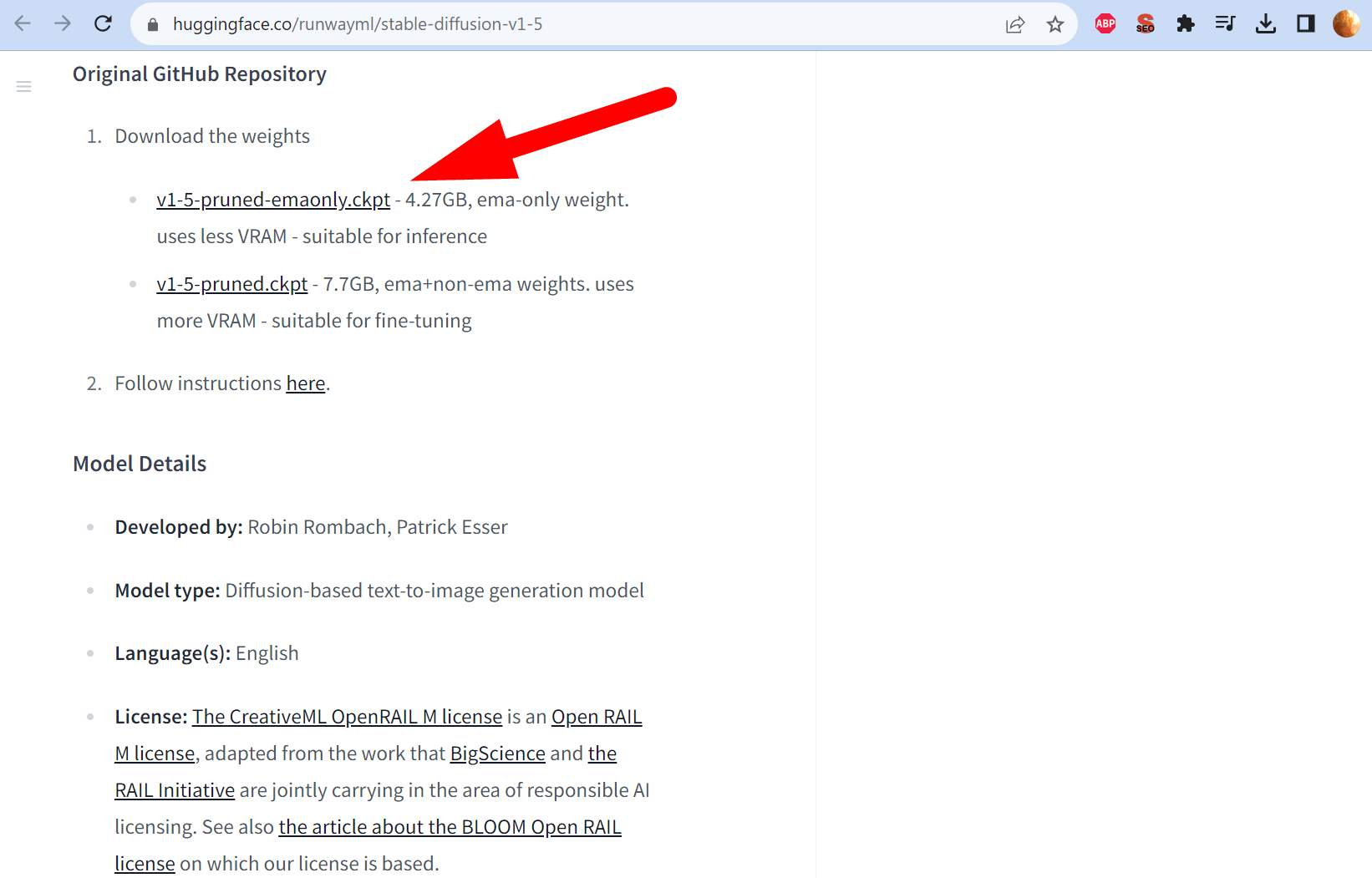 Чтобы работать в нейросети необходимо загрузить модель. Для новичков мы рекомендуем скачать Модель 1.5 на 4,27 Гб с официального сайта.