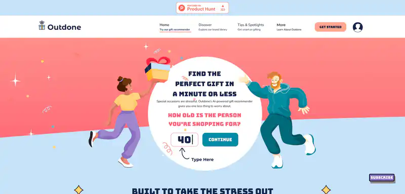 Outdone V2 — сервис подбора подарков на основе искусственного интеллекта. На сайте можно быстро найти идеальный подарок для любого человека, указав его возраст и интересы. Рекомендации по поиску подарков основываются на реальных данных потребителей и предлагаются продукты от сотен лучших мировых брендов. На сайте также есть раздел с советами по выбору подарков.