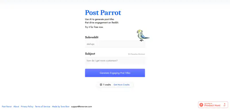 Post Parrot — это бесплатный маркетинговый инструмент, разработанный для использования на платформе Reddit. Он использует искусственный интеллект для генерации заголовков постов, которые привлекут внимание и увеличат вовлеченность пользователей.