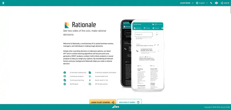 Сайт Rationale помогает бизнес-владельцам, менеджерам и частным лицам принимать рациональные решения в сложных ситуациях. Rationale использует новейшие GPT и алгоритмы обучения контексту, чтобы предоставить пользователям перечень плюсов и минусов, сгенерировать SWOT-анализ, провести мультикритериальный анализ или причинно-следственный анализ. Rationale также предлагает 4 техники анализа принятия решений, включая многоопционный анализ, анализ издержек и выгод, SWOT-анализ и список плюсов и минусов. Сайт также предлагает профилирование для персонализированного анализа, возможность настройки тона анализа, непрерывное обучение и результат в 10 секунд. С помощью Rationale вы можете принимать лучшие решения, основываясь на всех необходимых факторах и вашем опыте. Ограничениями сайта являются необходимость человеческого фактора при принятии решений и необходимость самостоятельно вводить информацию, чтобы получить анализ. Rationale не питается GPT-4, но использует последние GPT-алгоритмы и алгоритмы обучения контексту. SWOT-анализ используется для понимания факторов, влияющих на успех, а анализ плюсов и минусов используется для принятия информированных решений. Многоопционный анализ используется для помощи нерешительным людям в выборе между несколькими опциями.