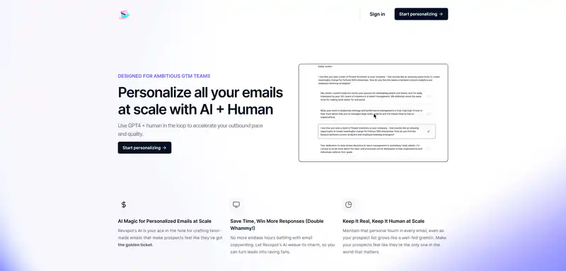 Revspot предлагает решение для персонализации электронных писем с помощью искусственного интеллекта (AI) и участия человека. Используя комбинацию GPT4 и помощи человека, вы можете ускорить процесс отправки персонализированных писем и повысить их качество.