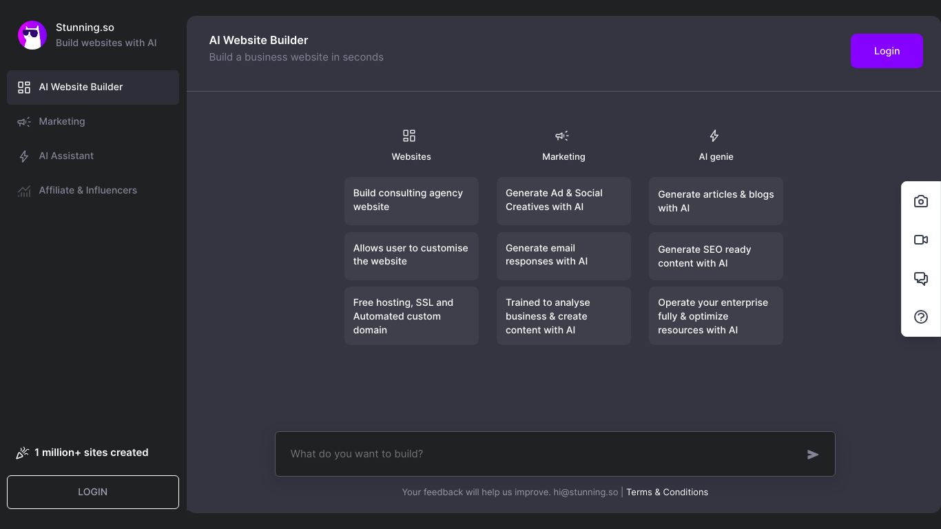 Stunning.so – инструмент, который объединяет в себе одновременно AI конструктор сайтов, а также мощный инструмент для маркетинга. Если вам недостаточно просто запустить сайт, но вы хотите превратить сайт в инструмент для вашего бизнеса, то Stunning.so – верный выбор. Сервис позволяет создать сайт для вашего бизнеса буквально за несколько кликов, после чего вы можете создать необходимые креативы для рекламы, а также тексты для блога.